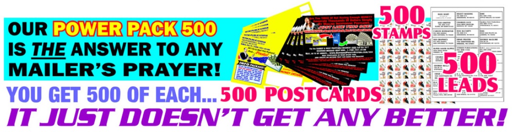 consists of 500 Free Postcards, Stamps & Leads or